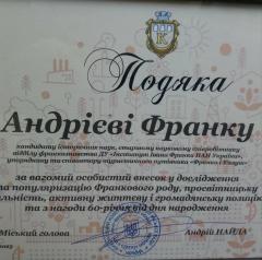 Слово про свого відомого предка сказав його внучатий племінник, кандидат історичних наук, науковий співробітник відділу франкознавства Інституту Івана Франка НАН України,  головний співупорядник видання Андрій ФРАНКО. Він наголосив на тому, що "Цей путівник має високий науково-джерельний рівень". Начальниця управління культури, національностей і релігій Калуської міської ради Любов ДЖУГАН вручила Андрієві ФРАНКОВІ Подяку міського голови  "за вагомий внесок у дослідження та популяризацію Франкового роду" і з нагоди його 60-річчя.