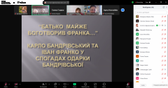 Старша наукова співробітниця музею Соломії Крушельницької Галина Тихобаєва представила доповідь «Батько майже боготворив Франка…» Карло Бандрівський та Іван Франко у спогадах Одарки Бандрівської». Модераторка міждисциплінарного наукового семінару, директорка Інституту франкознавства Наталя Тихолоз розпочала засідання інформацією про надання почесного звання член-кореспондент НАН України завідувачеві відділу франкознавства Інституту Івана Франка НАН України, багаторічному учасникові семінару «Перехресні стежки» Миколі Легкому. Ця приємна новина викликала хвилю емоційного піднесення, учасники бажали Миколі Легкому подальших відкриттів та здобутків у наукових літературознавчих пошуках. Після вітальних слів модераторка представила доповідачку та надала їй слово.