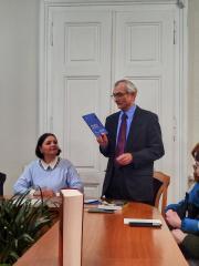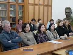 Директорка Інституту франкознавства Наталя Тихолоз, яка модерувала презентацію, надала слово для привітання деканові філологічного факультету, Романові Крохмальному: «Біографічні описи та їхнє впорядкування – це дуже важлива праця. Хочу подякувати добрій співпраці наших колег, партнерів з Інституту Івана Франка, дякую Вам за прекрасні видання!».