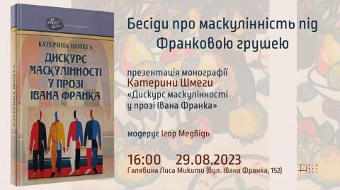 "Бесіди про маскулінність під Франковою грушею" — під такою назвою відбулася презентація книжки К. ШМЕГИ "Дискурс маскулінності у прозі Івана Франка", яку модерував заступник директора Дому Франка, к. істор. н. Ігор Медвідь.